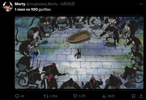 而一旁的索隆则是来了个倒反天罡,上演了一人vs一百只猩猩的奇观。(并非猩猩)