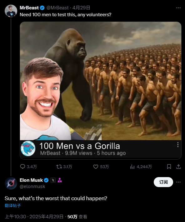 甚至连马斯克也来凑这趟热闹,他表示只要野兽先生敢拍,那自己也敢参与其中。