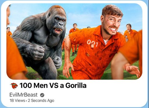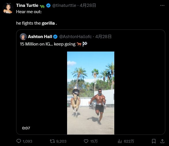 既然大伙都这么喜欢搞抽象,那就一搞到底,也不知道是跟风玩梗还是真有意图,外网顶流博主野兽先生表示有这么好的节目素材怎么能少得了我?立马在推特上发文进行招募,按照以往的风格,视频标题我都想好了,就叫《100个人为了100万美元与一个大猩猩进行决斗》。