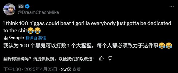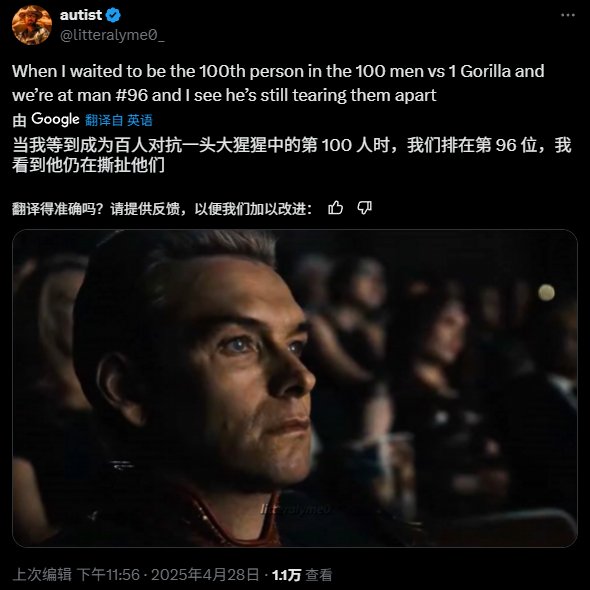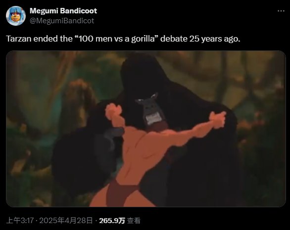 在4月25日,一位网友在推特上发了篇这个帖子,他认为只要凑齐100个团结一心,愿意全力以赴的人类就可以打败一只大猩猩。