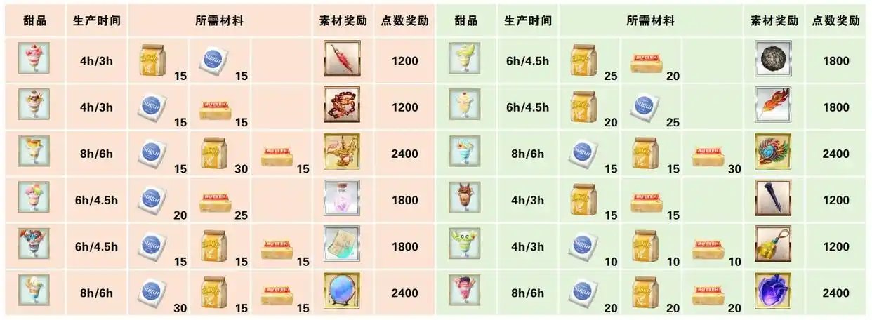 可制作的甜品一共是12种,随主线开启而增加种类,并且能同时制作的种类也会提升,这里的表格总结了所有甜品的制作时间、所需材料和可获得的奖励。