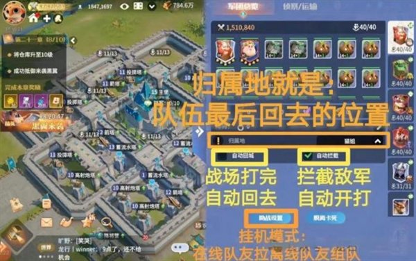 ②自动回城:队伍打完仗,这些队伍自动就回城了。建议:关闭自动回城。