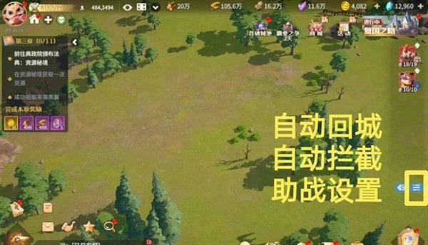 龙石战争,队伍可以开启“自动回城”,“自动拦截”,“助战设置”。