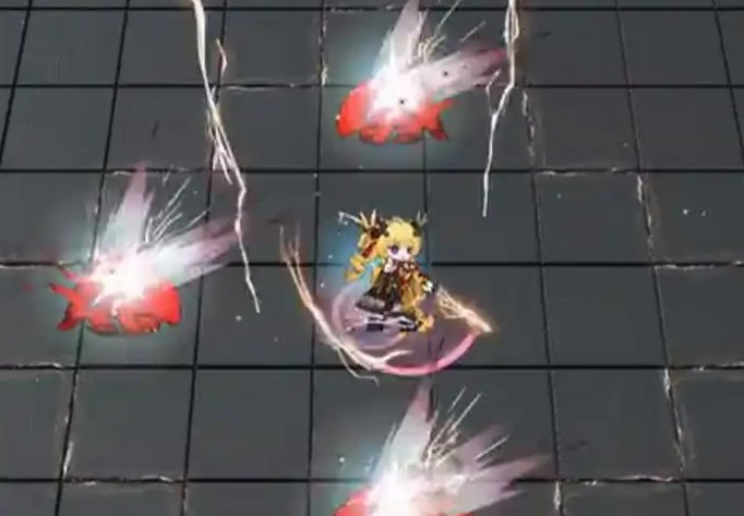 二技能:攻击范围沿着地面地块扩展到最远三格,攻击对数个目标造成相当于攻击力一定比例的物理伤害。技能期间每次落雷使攻击力提升(最多可叠加数次)