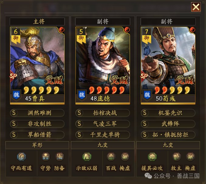 搭配思路:这队魏弓搭配有一半伤害是反击,用抬棺启动千里走单骑,再联动镇扼防拒的援助,所以庞德的兵书用的示敌以弱+百战,为了让抬棺发动更稳定,千里才能触发更多。