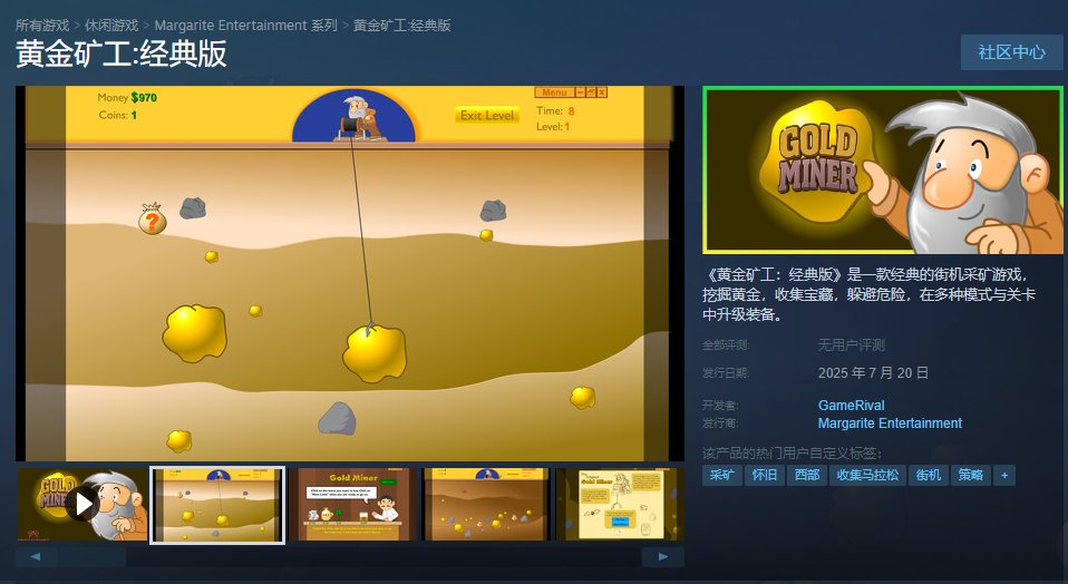 而说到童年经典,怎么能少得了那款游戏呢?没错,前段时间Margarite娱乐在社交平台官宣,《黄金矿工:经典版》将于7月20日在steam上正式发售。
