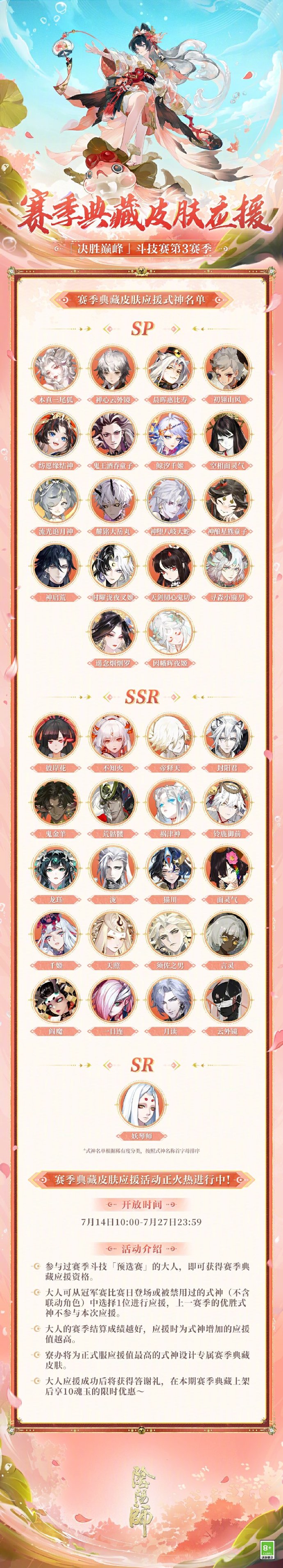 赛季典藏皮肤应援已于今日开启,寮办将为应援值最高的式神设计专属赛季典藏皮肤!
