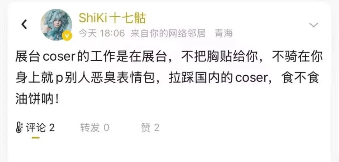 大概晚上的时候,就有人开始急了,开始声讨这两位韩援破坏国内Coserplay这片净土!大概意思就是表达:“Coser不是鸡,不是卖的!”在这里咱们就举一个例子当典型。