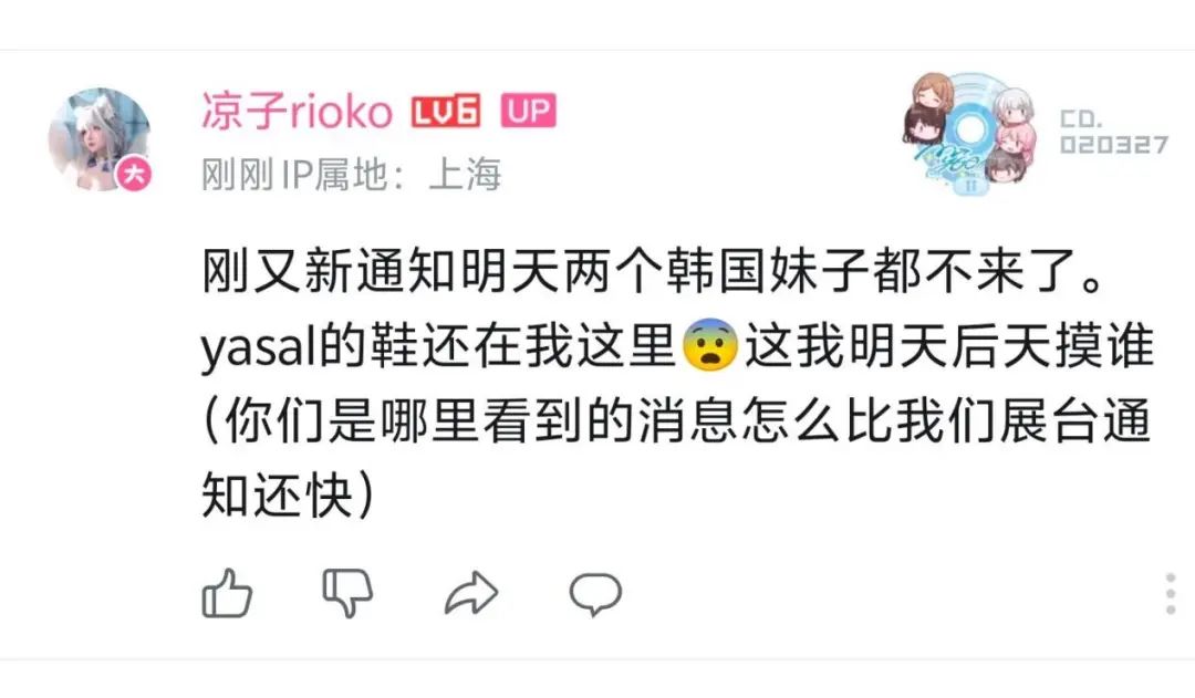 然后时间线进展到了晚上,就有消息表示这两位韩援小姐姐被举报了,明天已经不允许上台了,随后这条消息也得到了同展台Coser凉凉子的证实。