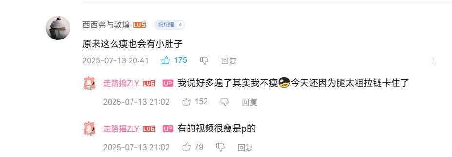 而且跟粉丝在线上交流也没啥架子,真是粉丝问啥,她说啥。就比如有人说她有小肚子,换做其他人,不网暴说这话的人,至少也是无视,但走路摇表示:这确实,我很多视频都是P瘦的。