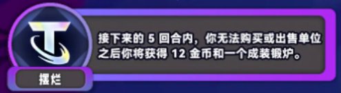 接下来的5回合内,你无法购买或出售单位,之后你将获得12金币和一个成装锻炉。