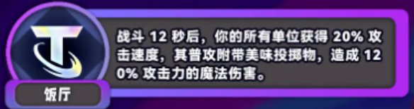 战斗12秒后,你的所有单位获得20%攻击速度,其普攻附带美味投掷物,造成120%攻击力的魔法伤害。