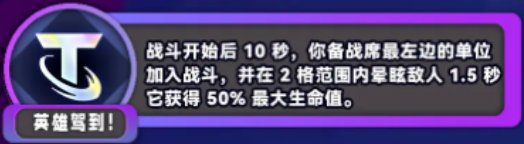 战斗开始后10秒,你备战席最左边的单位加入战斗,并在2格范围内晕眩敌人1.5秒它获得50%最大生命值。