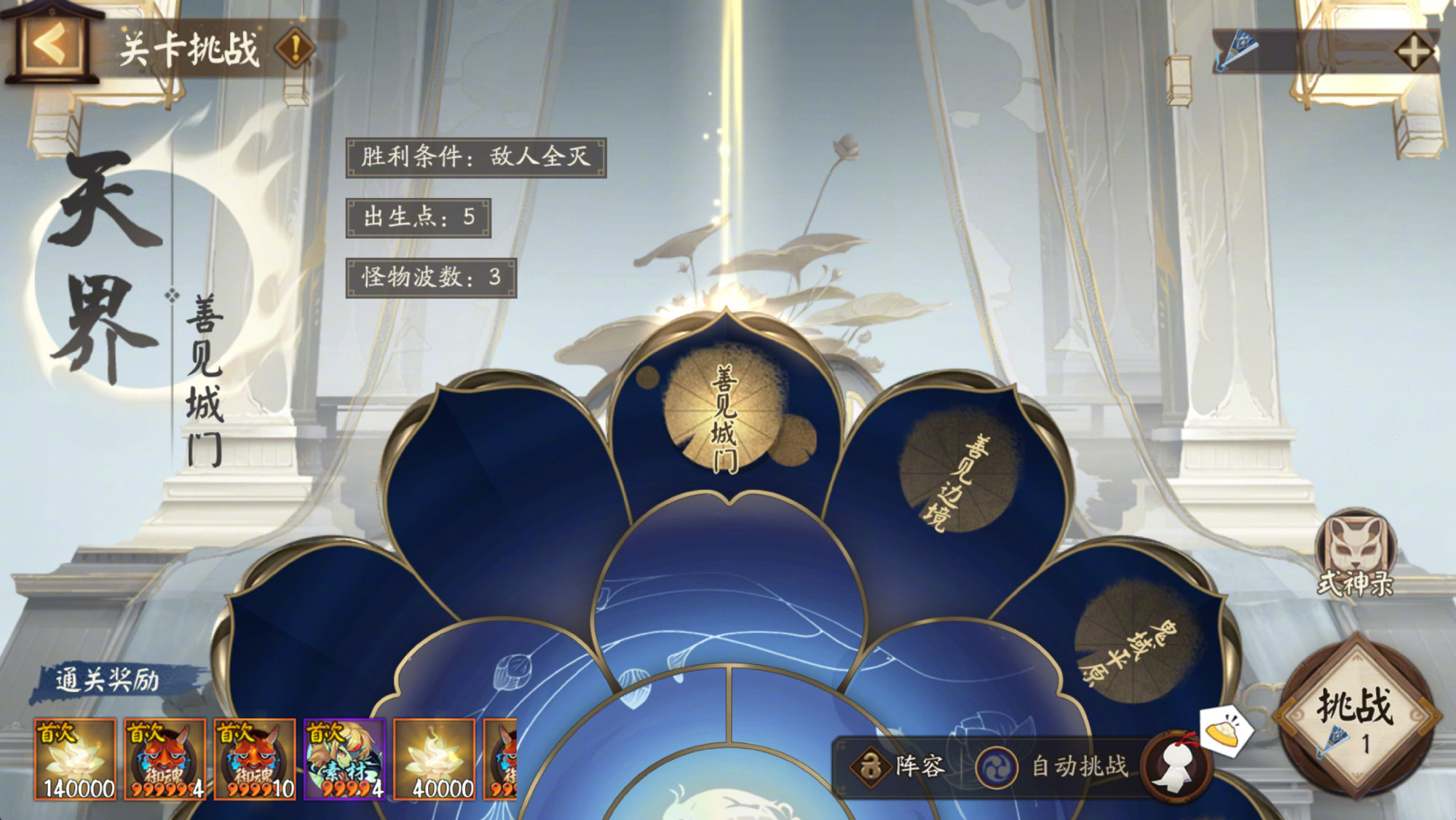 ※关卡挑战:关卡挑战开启时间为7月23日至7月31日,前7日的每天0点解锁一个新的关卡,大人可通过消耗「天元扇」选择挑战关卡。在副本战斗开始前大人可选择本局中需要控制的式神,取得副本胜利即可获得随机御魂等掉落奖励,并结算角色任务。