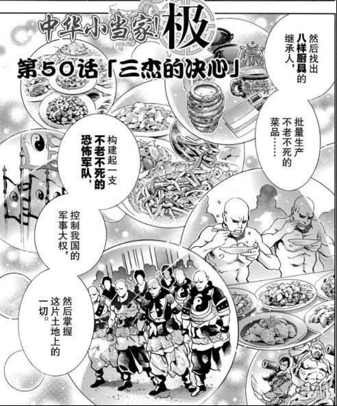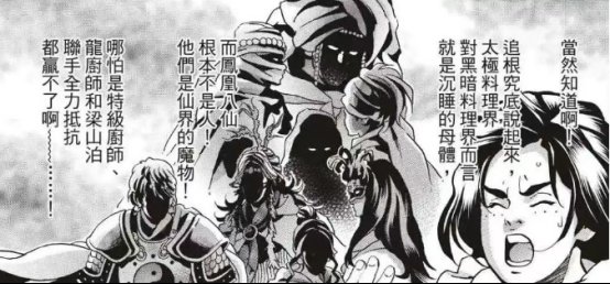 然后是本作登场的反派组织太极料理界,你可以把它理解成是上限更高的黑暗料理界,这里面的厨师被称为凤凰八仙,逼格也是被描绘地相当地高,你看看原文里是怎么说的,凤凰八仙甚至都不是人而是来自仙界的魔物,属于是特级厨师、龙厨师、梁山泊联合底坑都战胜不了的存在。
