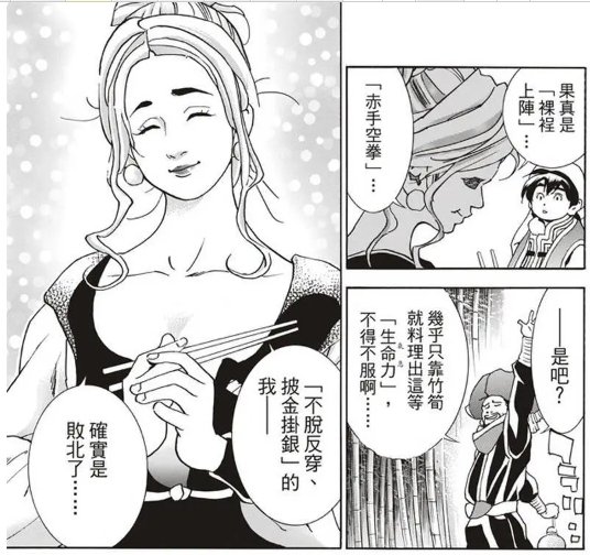 说完了漫画的大致背景,很自然地就会产生这样的疑问,这些做菜的都是神仙级别的水平了,那参与评审的评委肯定也不简单吧?你看,这不都对上了吗,最新的剧情是小当家和八仙之首丁泰凤的厨艺对决,也就是开天辟地的创造神盘古才有资格成为他们的评委。