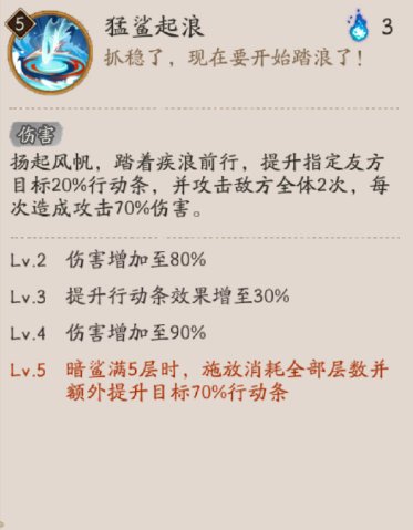Lv.5 暗鲨满5层时,施放消耗全部层数并额外提升目标70%行动条