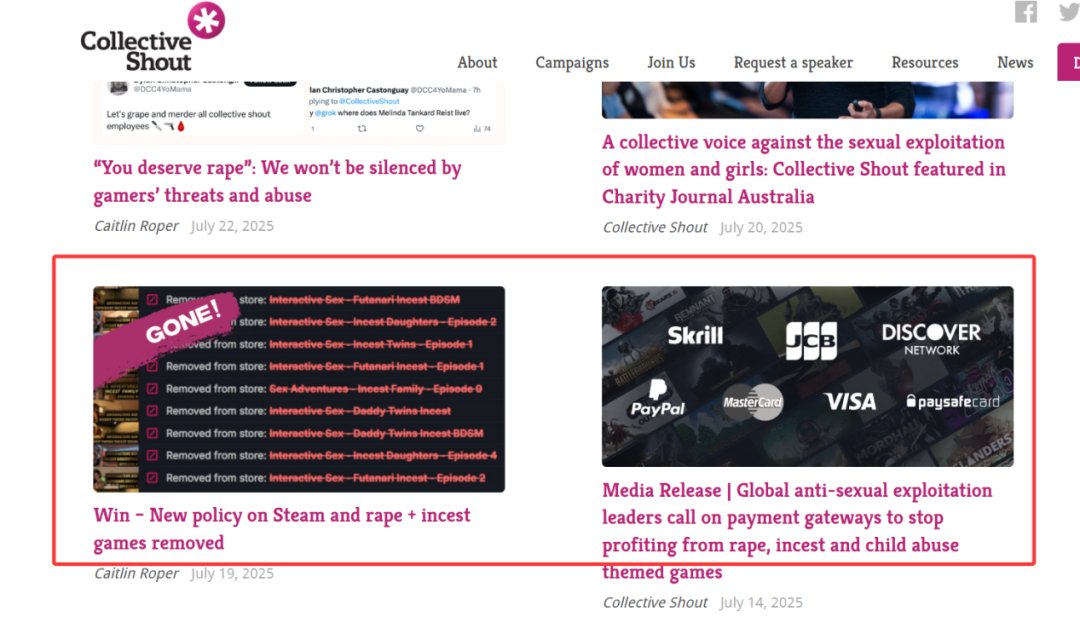 所以这并不是什么偶发事件,而是一直在进行的“赛博猎巫运动”。至于幕后黑手,前文中提到的那家名为“Collective Shout”的组织在自己的官网上表示:是它们的“功劳”。