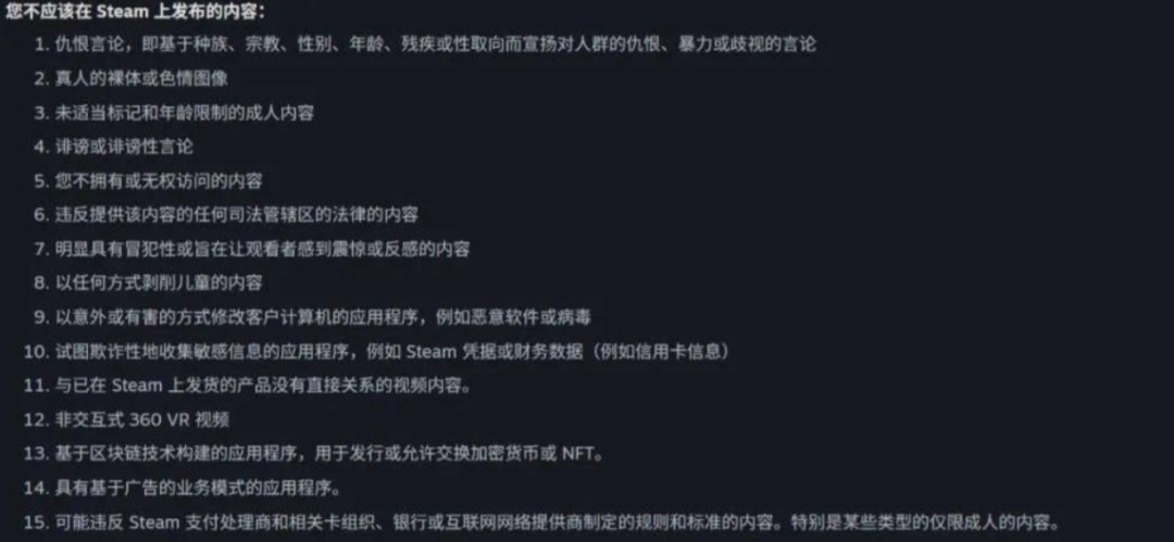其中最重要的是第十五条:可能违反Steam支付处理商和相关卡组织、银行或互联网网络提供商制定的规则和标准的内容。特别是某些类型的仅限成人的内容。