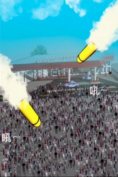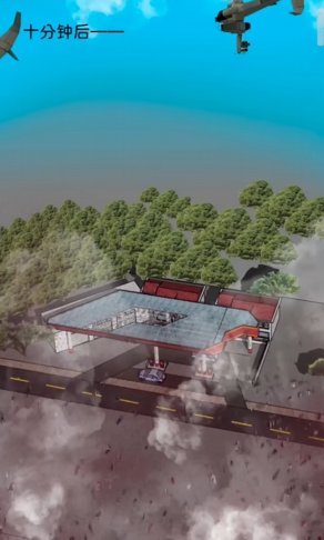 而且这一幕的槽点也是多到不行,这里画的建筑怎么看都应该是加油站吧,那我问你,谁家的加油站能在被导弹轰炸了十分钟后依旧能完好无损地摆在这啊,甚至连停在一边的蓝色小轿车也是一点事都没有。