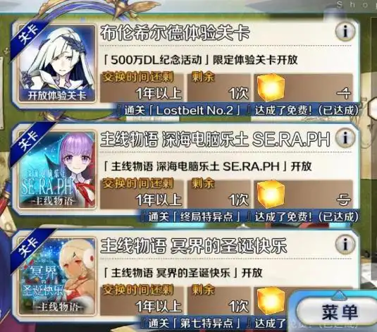 主线物语的话也有不错的奖励,其中大奥最适合用来刷这次的关卡次数,因为关卡多且都是1AP,然后虚数海战的关卡也蛮多。
