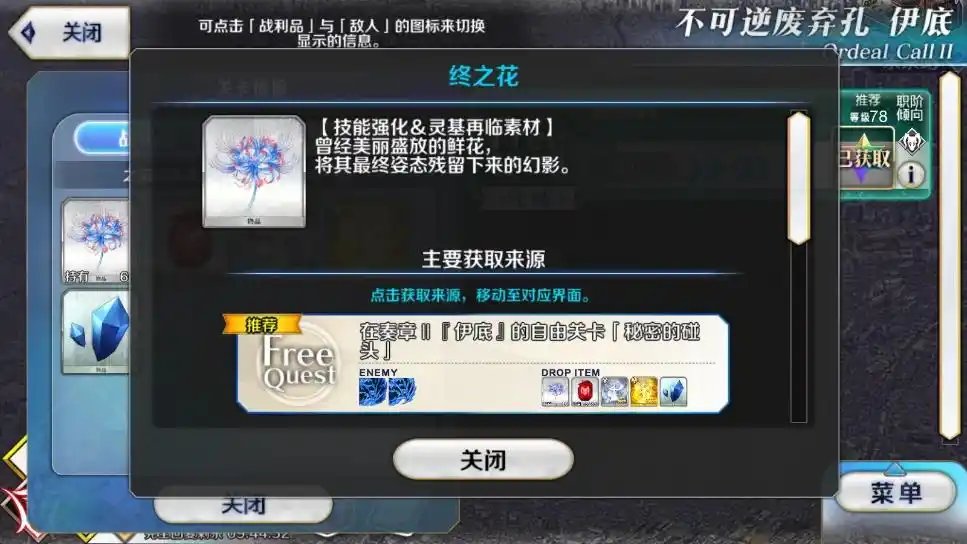 然后就是关于想要为近期的新从者刷材料的话,也可以去对应的关卡刷,例如兽艾蕾和学姐都是终之花和黑曜锐刃的大户,终之花可以去奏章2地图的【自家】刷,黑曜锐刃则是在2.7章的【坠机点】刷最好,缺黑灰的话依旧是在第五特异点的【夏洛特】刷。