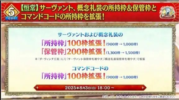 从者、礼装和纹章仓库扩充100个,灵基保管室扩充200个