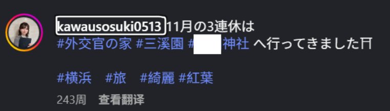 这张照片可能看不出来,但如果我们放大就会发现她加了“鬼子神社”的tag,这应该是分享她当时的行程。