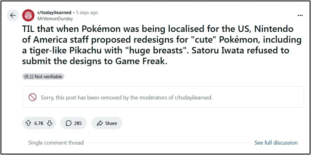 事情是这样的,前段时间美国的Reddit(类似国内贴吧)上突然有个老哥发帖表示:宝可梦进军北美时,任天堂美国分部建议最好重新设计下皮卡丘。因为这么可爱对美国人来说没吸引力,最好设计成一个大胸妹!