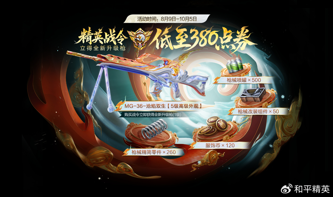 特种兵购买精英战令可立即获得全新5级升级枪:MG-36-沧焰双生(1级),邀请好友砍价可降低精英战令价格,原价1280点券的战令最低可砍至380点券。