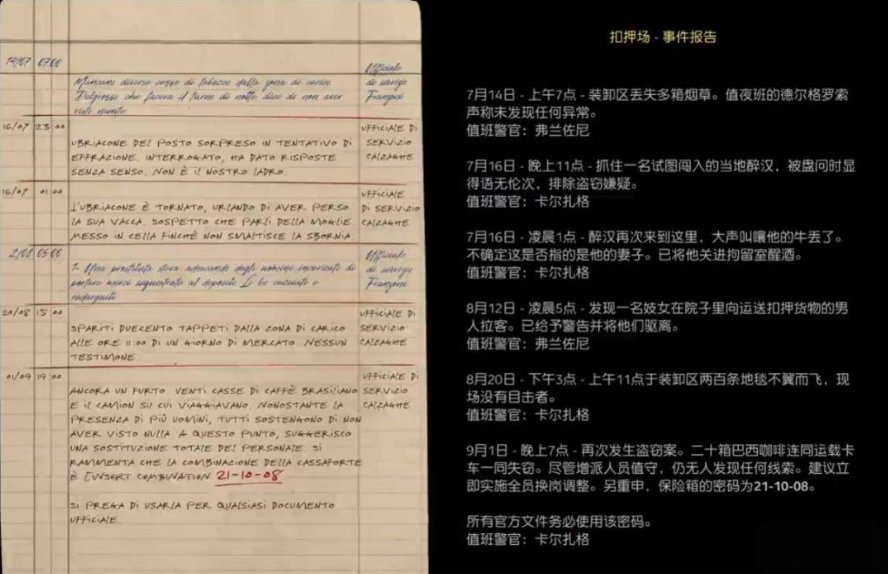 密码的线索在办公室左后方的抽屉柜上,拾取文件【扣押场-事件报告】即可看到密码线索。
