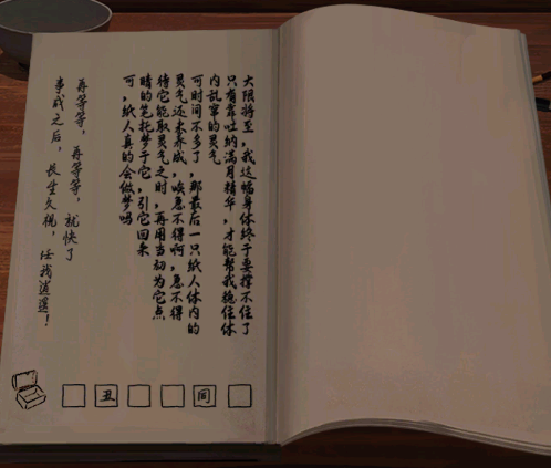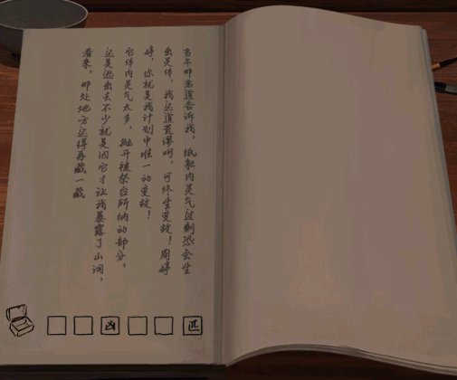 8、进入屋内,点击桌上的书册,观察书页下方的图案和文字,根据提示将小茶几上的盒子进行点击右左上下下右,获得2个字块。