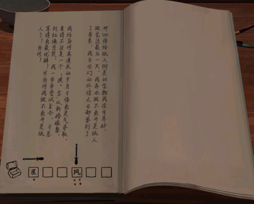 6、回到之前的屋子点击桌案,在桌上获得毛笔,来到戏台,将折扇给右侧的纸人。