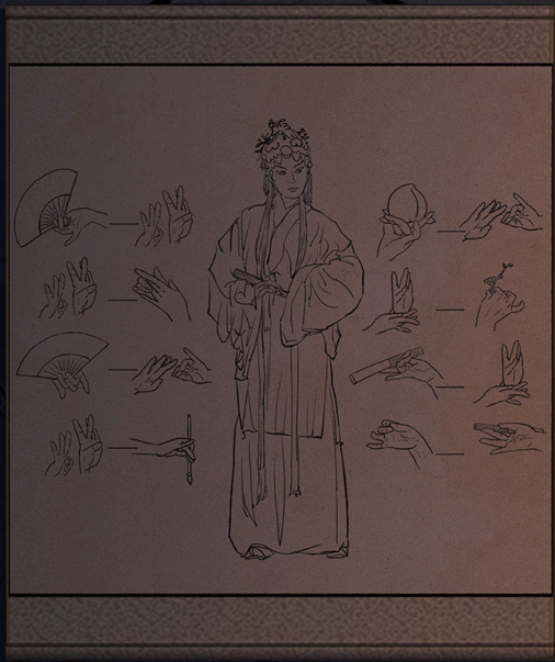 7、回到2楼,点击墙上的挂画。将戏台上左侧纸人的手势进行调整,每次调整右侧的纸人也会进行相应的调整,获得纸桃花。