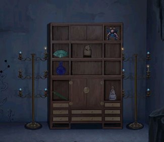 11、回到2楼,在大瓷瓶的下面获得字块。点击财神像的供桌,根据刚刚获得的提示调整水果的位置,获得字块。