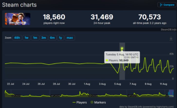 先给不玩这游戏的观众们说明一下,街霸6这游戏的数据曲线可以说是相当稳定,平均下来基本上都是维持在2-3万的日活水平,正是因为有如此稳定的数据,使得卡普空过去很长一段时间对这个游戏一直都是一种很佛系散养的状态,除了每年必要的推出四位新角色时会搞点大动静,其余时间推出的基本就是些不痛不痒的小活动。
