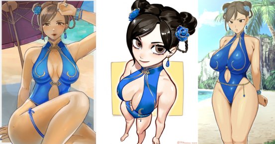 优秀的颜值、清凉的泳装、丰满的大腿,三位一体的融合重重砸在了玩家的心头上,尤其是一直都好这口的欧美市场,春丽这皮肤一经公布就引发了激烈的创作潮。