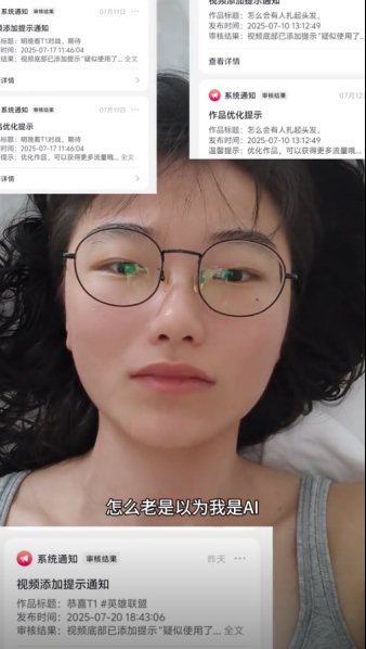 时间长了那副样貌也跟着越来越有既视感,以至于不少不明所以的路人都以为这是AI换脸整活的,说来也挺难绷的,她只要发视频,抖音的系统都会自动添加上疑似使用了AI的提示,属实是给博主整无奈了。