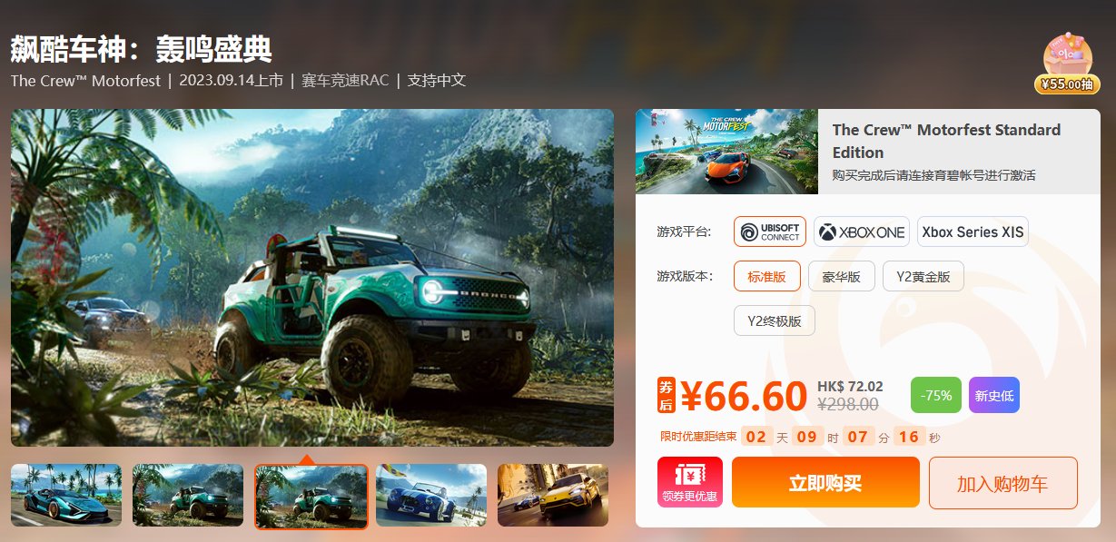 《飙酷车神:轰鸣盛典》新史低 券后:66.6元