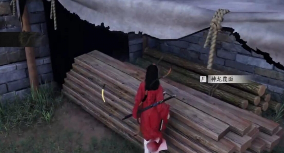 4、从缝隙过去在木板上找到【神龙覆面】,把道具给【苗阿远】完成任务。