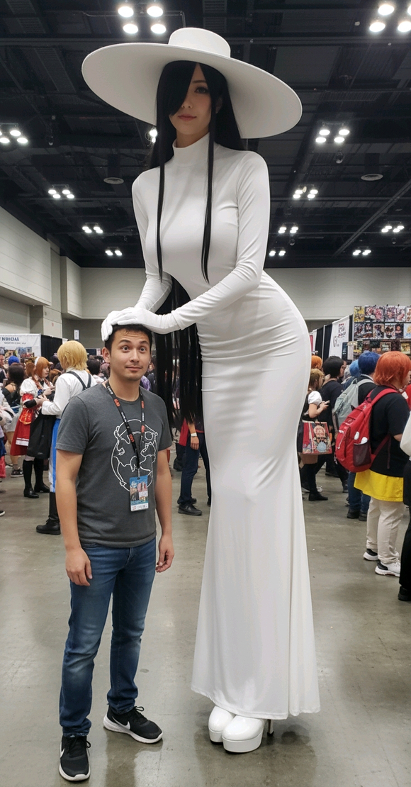 不仅如此,AI还可以办到一些Coser不能办到的事,比如“八尺夫人”,真人是没有这个身高的。