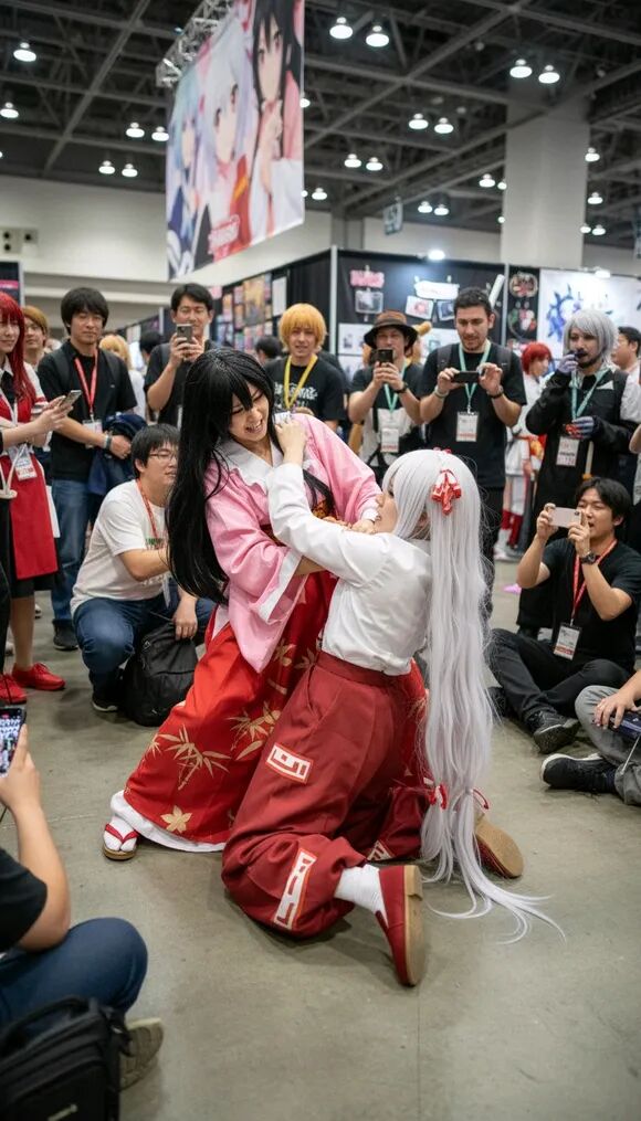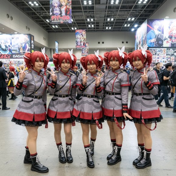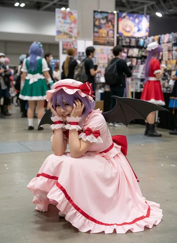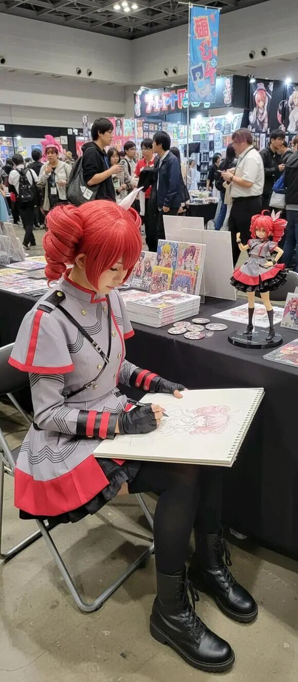 不仅仅是只生成一个Coser这么简单,你甚至还可以让她做一些复杂的场景,比如“在漫展上画画”——当然因为学习能力的问题,AI还是将画桌给生拉硬搬进了“漫展中”,但已经非常厉害了。特别是路人的,你非常难以看出这是AI。