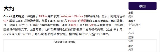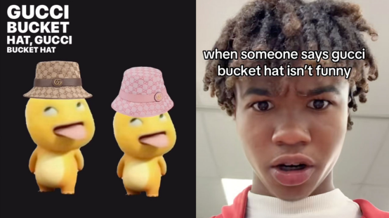 而至于为什么会在今年八月掀起一阵奶龙热,我想大概率是和外网流行的另一个抽象梗有关,这个梗的名字叫“GucciBucketHat”,玩法就是让任意一个角色戴上渔夫帽配合着同名歌曲《GucciBucketHat》的节奏跳无意义的舞蹈,就如同大多数外网梗一样,如果没有外网环境的渲染,这个梗看着确实挺让人莫名其妙的。