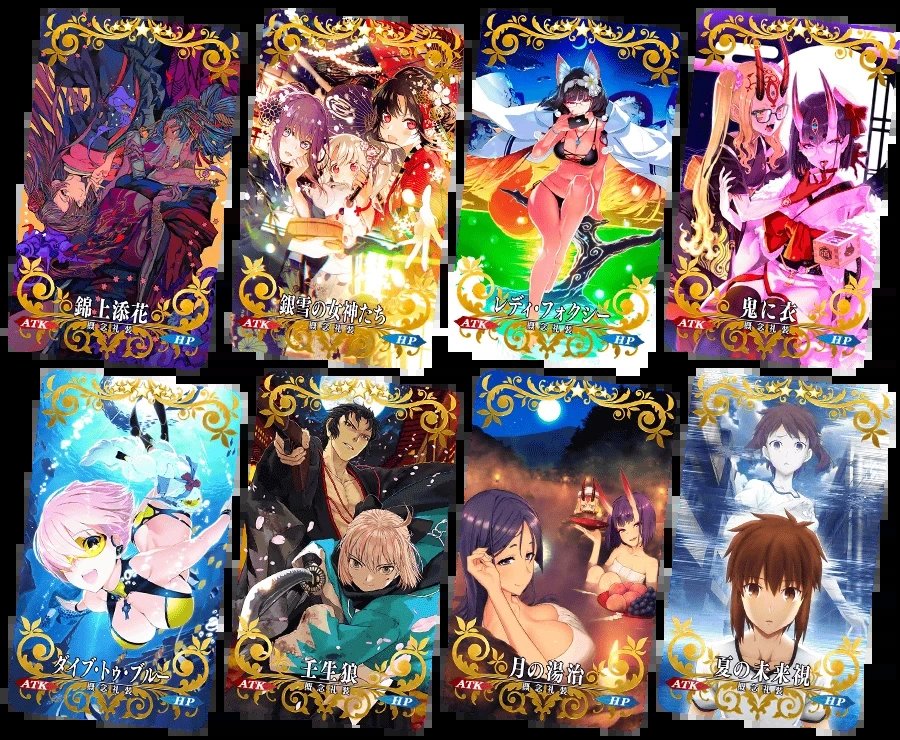 今年10月的3000万下载纪念活动会上架以上10张礼装,这里特别推荐兑换的就是【九首牛魔罗王】,这张在很多高难爆破场合都会用到,其他类似【樱树冰垂】【巫女姬的片刻闲暇】也可以兑换。