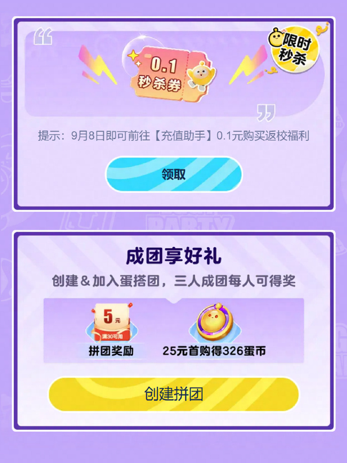 除此之外,蛋仔们还可以组成蛋搭团,满3人即可获得8.3折代金券哦!