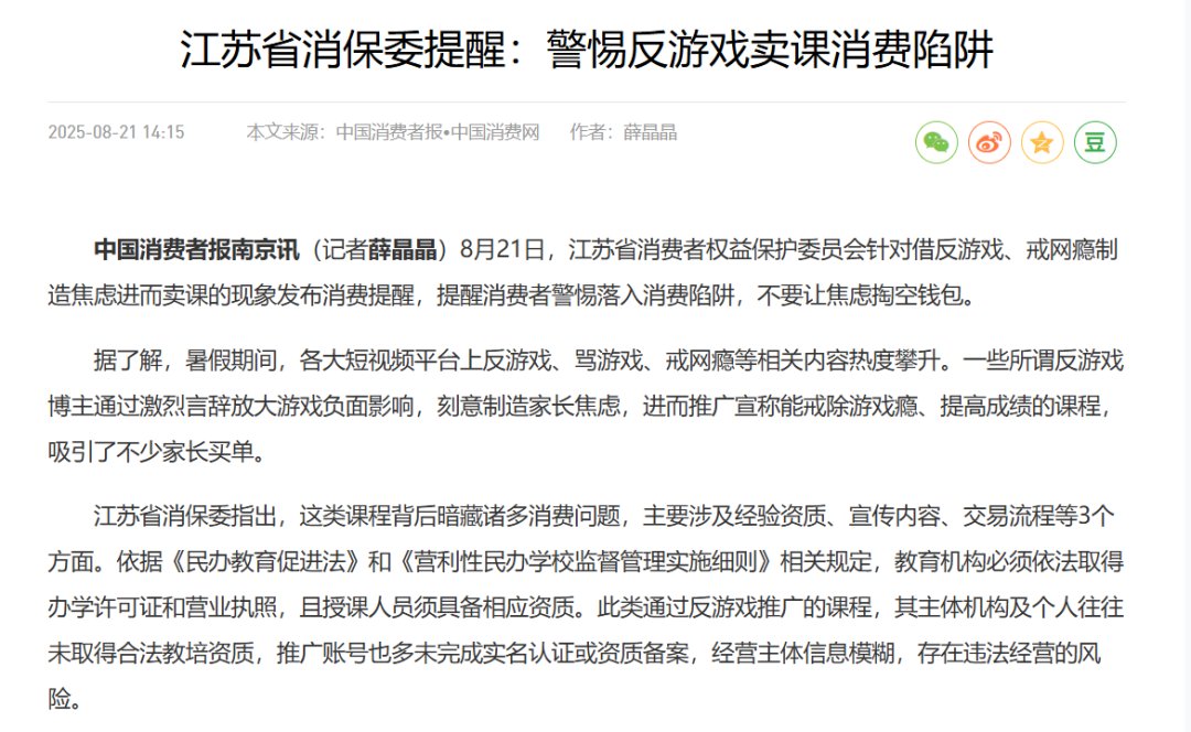 前几天,一条由中国消费网发布的“警惕反游戏卖课消费陷阱”新闻引起了我的注意。我一时间有点懵,我反复观看,确认我真没有看错。