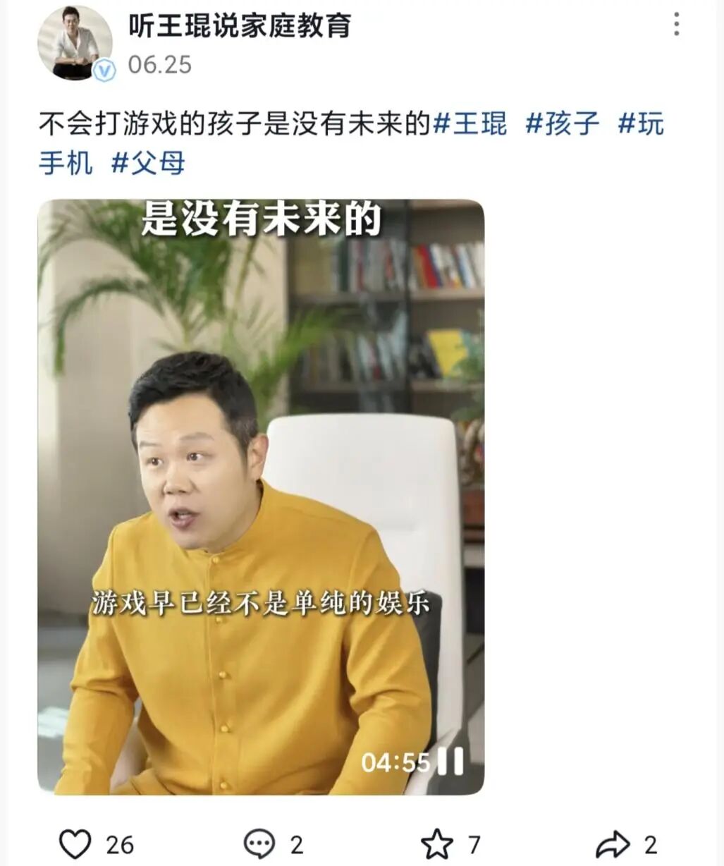 到了6月份,更进一步,直接表示:“不会打游戏的孩子,是没有未来的!”