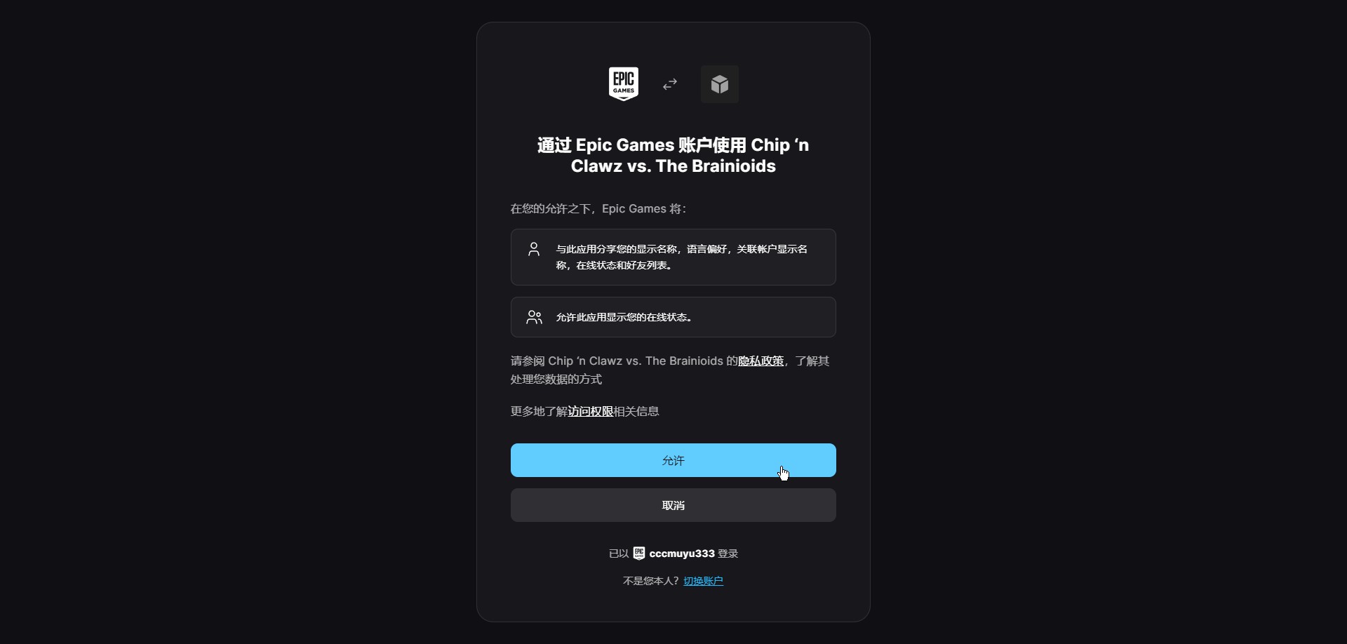 注意:游戏主界面点在线会先自动弹到默认浏览器上,让你登陆一下epic,然后允许一下,你登录之后进到游戏中。(没有账号的话就注册一个epic账号)