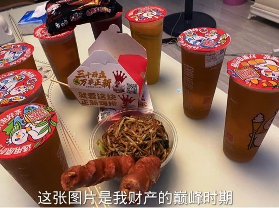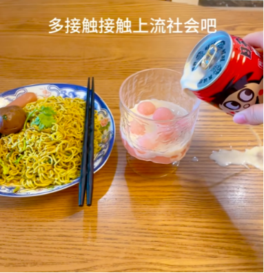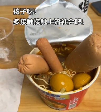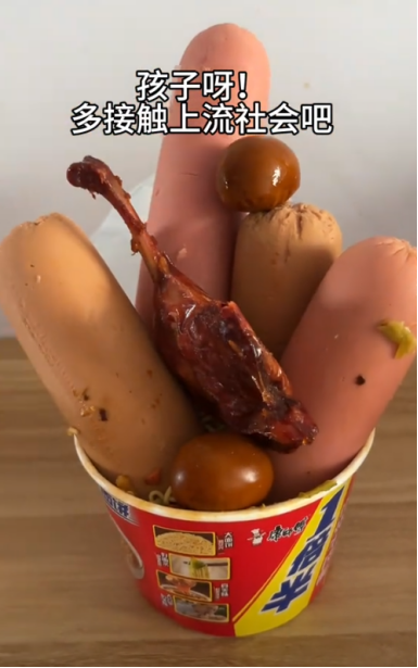 在吃的这块,唯有泡面的出场次数能与冰红茶抗衡,你永远也不知道网友们为了“炫富”能往泡面桶里加多少辅料,那些已经加到冒尖的火腿肠、卤蛋、鸡腿在他们眼里就如同红海参、阿尔巴白松露、神户牛肉等高端食材,仿佛吃下去的每一口都散发着厚实的分量感。