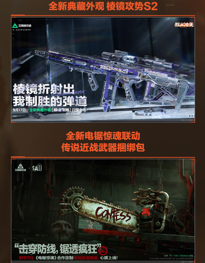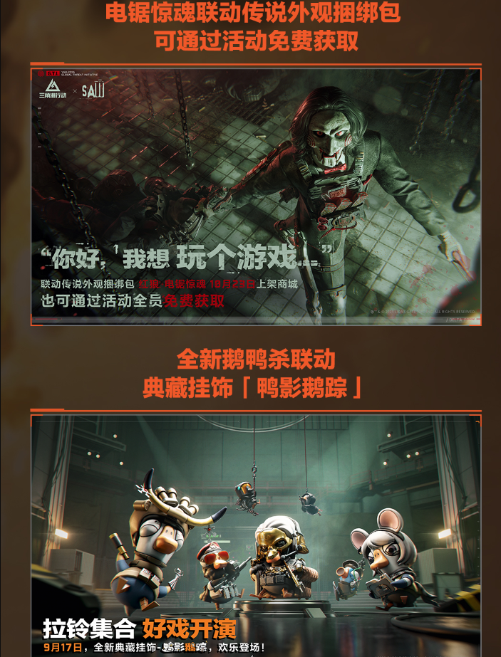 3、全新道具上线,全新典藏外观「棱镜攻势S2」、全新电锯惊魂联动传说近战武器、全新鹅鸭杀联动典藏挂饰「鸭影鹅踪」,以及更多稀有收藏不容错过!
